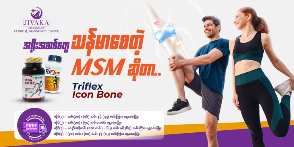 🌐 ဈေးကွက်ထဲတွင် MSM ကို အရိုးအဆစ်များအား ခိုင်ခံ့စေသော Glucosamine, Chondroitin တို့နှင့် တွဲဖက်ပြီး ထုတ်လုပ်ရောင်းချကြပါတယ်။ Viva Icon Bone, Triflex (GNC) စတဲ့ ထုတ်ကုန်တွေက အဆစ်များကို သက်သောင့်သက်သာဖြစ်စေပြီး ချောမွေ့စွာ လှုပ်ရှားနိုင်အောင် လုပ်ဆောင်ပေးနိုင်တဲ့အတွက် ဒူးနာ၊ ခါးနာ၊ ကျီးပေါင်း ဝေဒနာသည်များအနေဖြင့် ပုံမှန်မှီဝဲပေးသင့်ကြောင်း တင်ပြလိုက်ပါတယ်ရှင်…💜